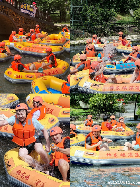 团建的第一天,大家怀揣着激动的心情来到了禅龙峡漂流。这里的河道蜿蜒曲折,水流湍急,两岸青山环绕,景色美不胜收。当大家坐上漂流艇,顺着水流一路飞驰而下,尖叫声、欢笑声回荡在山谷之间。湍急的水流带来了无尽的刺激,每一个急弯、每一次落差,都让人心跳加速。大家相互泼水、相互帮助,在水中尽情释放着工作中的压力,感受着团队的力量和欢乐。
